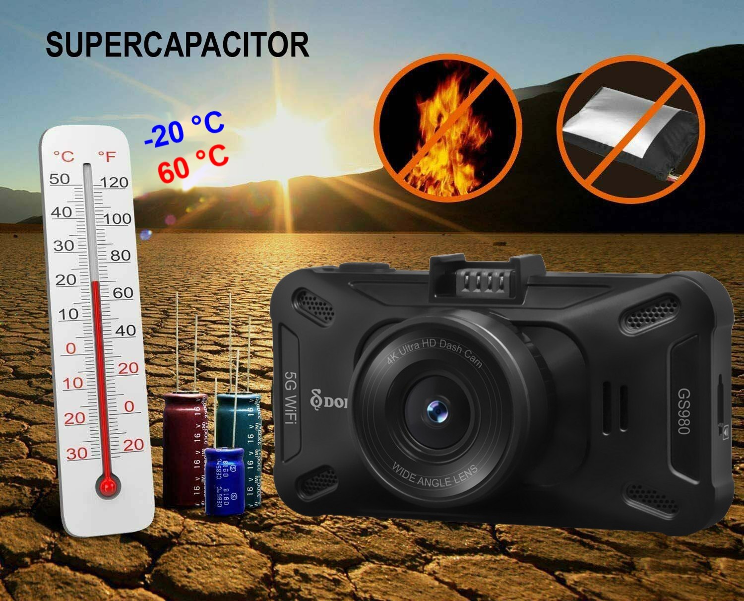 Kamera DOD GS980D ima namesto litijevih baterij vgrajen super kondenzator . Superkondenzator zagotavlja boljšo zaščito pred višjimi temperaturami in ni nevarnosti poškodb ali eksplozije kot pri klasičnih baterijah. Zagotavlja tudi daljšo življenjsko dobo kot kamere na armaturni plošči z litij-ionskimi baterijami.